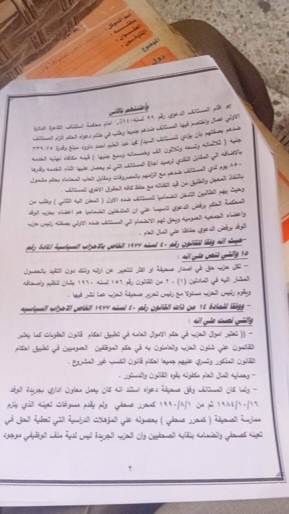 وأشارت صحيفة الدعوى إلى أن المدعي تم تعيينه بوظيفة سكرتير تحرير بالجريدة، ويستند في دعواه إلى عدد من مواد قانون الأحزاب السياسية رقم ٤٠ لسنة ١٩٧٧، ومنها المادة 15، التي تمنح الحزب الحق في إصدار صحيفة دون التقيد بأحكام قانون النقابة.